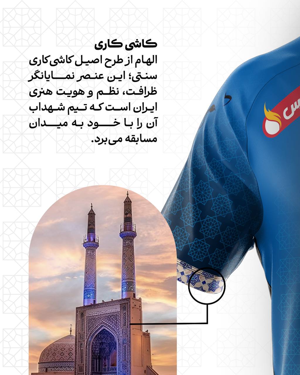 کاشی‌کاری سنتی ایرانی نیز با الهام از طرح‌های اصیل یزد در بخش‌هایی از لباس به کار رفته است. این نقش‌ها بیانگر ظرافت، نظم و هنر ایرانی هستند و تیم شهداب این میراث ارزشمند را با خود به میدان مسابقه می‌برد.