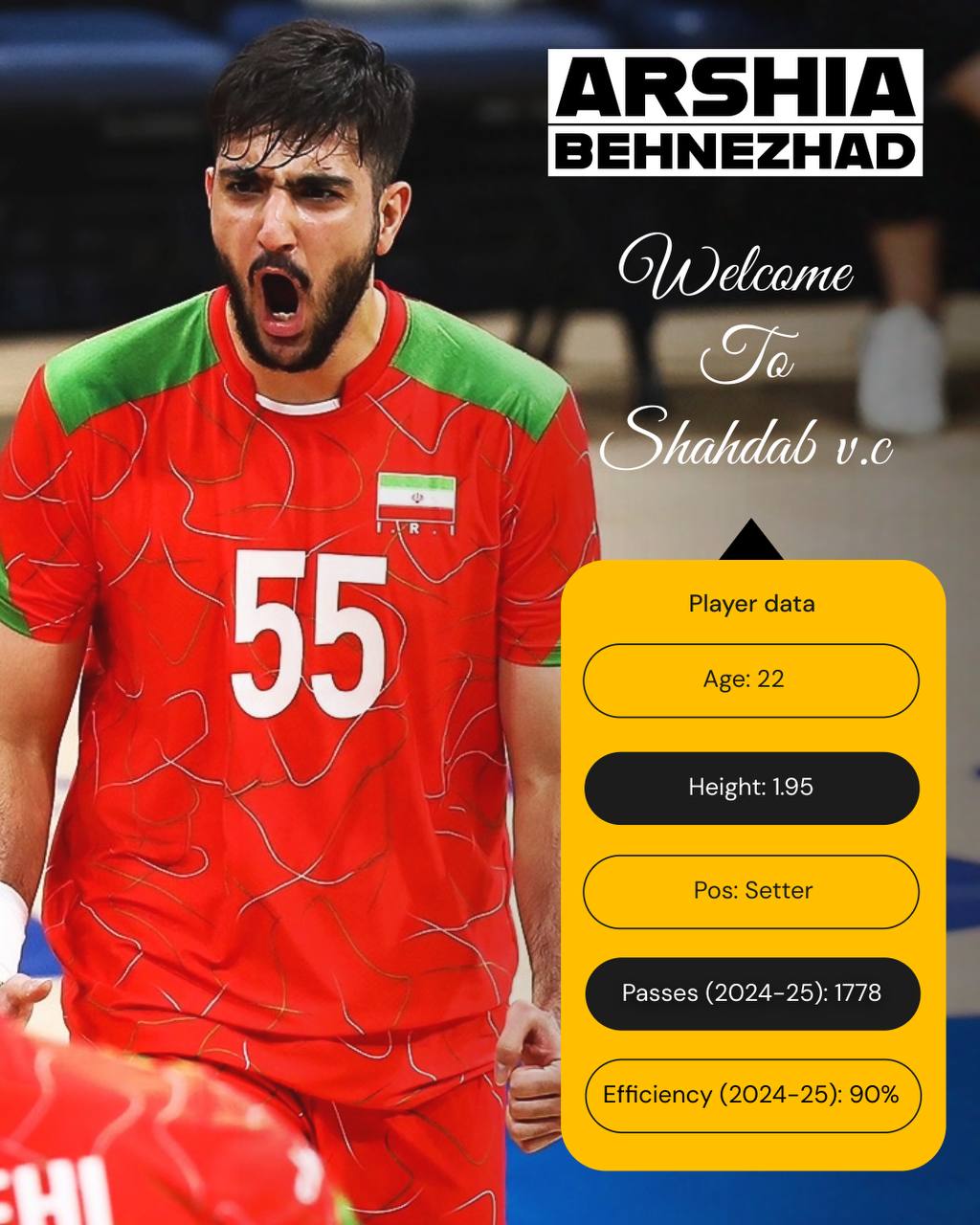 لازم به ذکر می باشد که عرشیا به نژاد شماره (شماره پانــــــــــز(۱۵)ده) تیم والیبال #شهداب_یزد را در فصل آینده بر تن خواهد کرد.