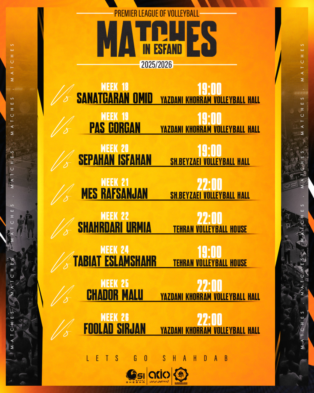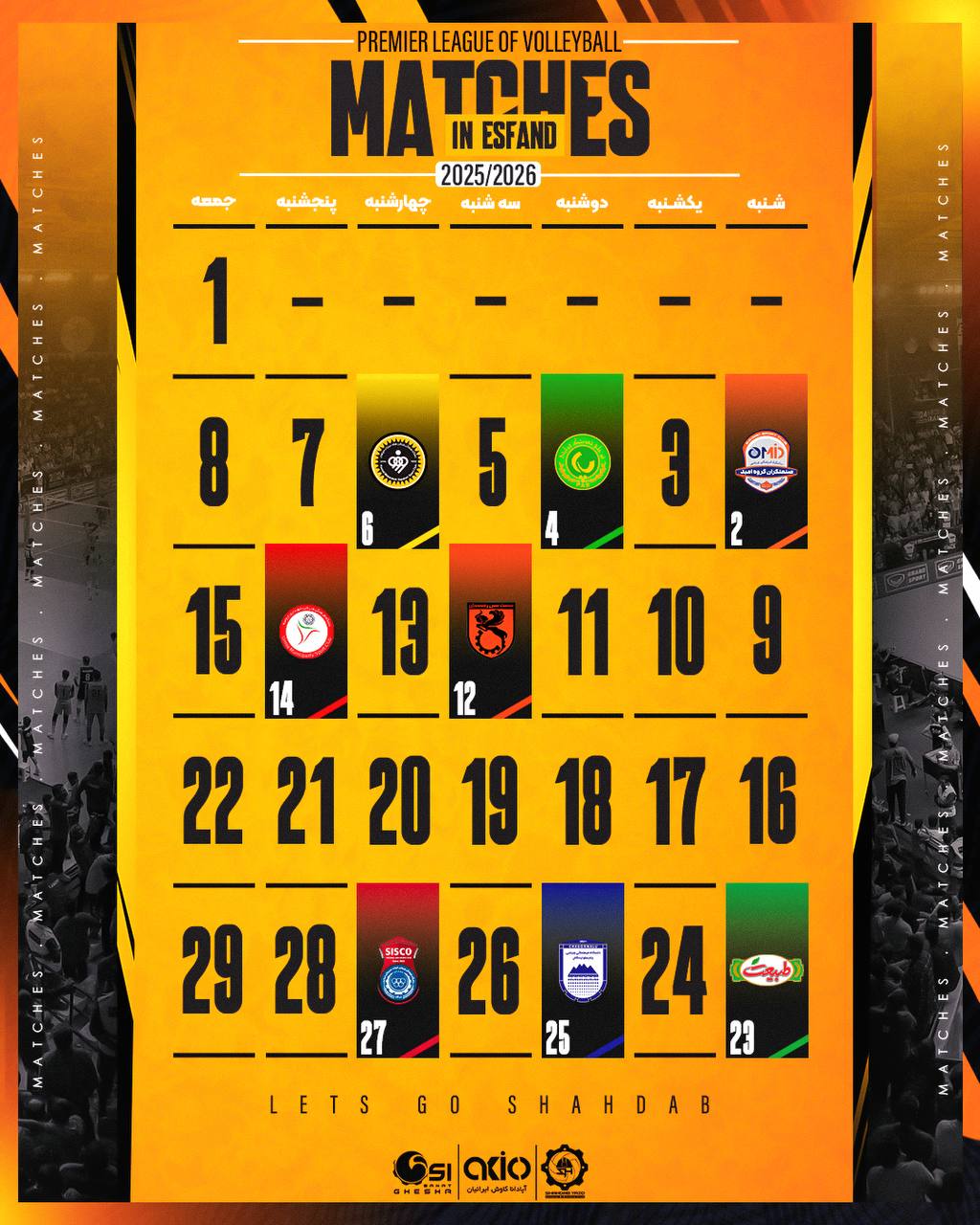 برنامه دیدار های تیم والیبال #شهداب_یزد در ماه مبارک رمضان ( هفته‌های ۱۸ تا ۲۶ لیگ برتر ) تا پایان دور گروهی رقابت های لیگ برتر والیبال مردان در فصل ۰۵-۱۴۰۴