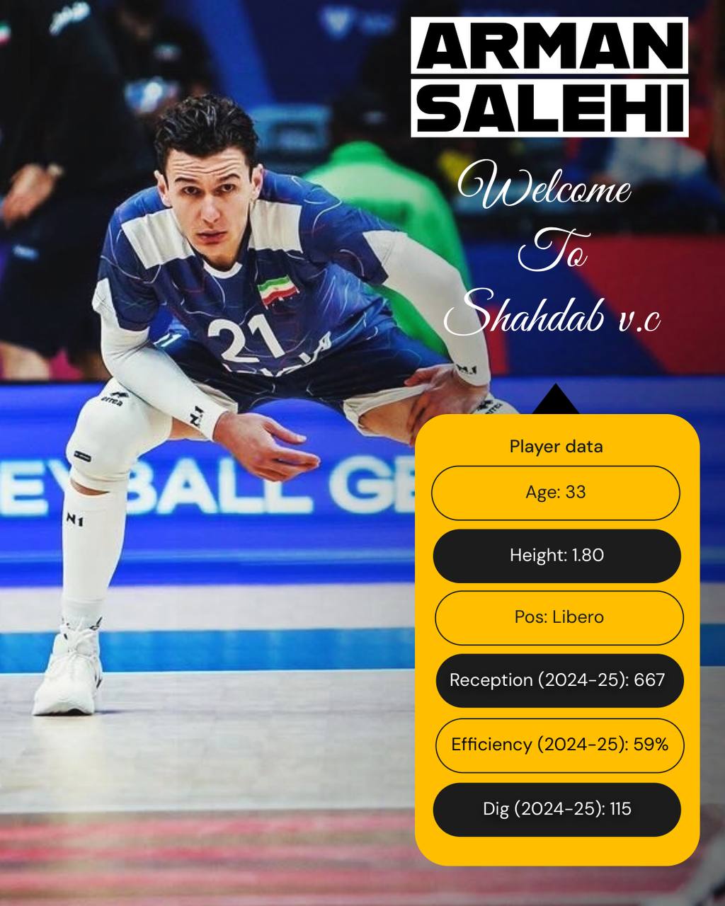 لازم به ذکر می باشد که آرمان صالحی پیراهن (شماره بیســـــ(۲۱)ت و یک) تیم ‌والیبال #شهداب_یزد را بر تن خواهد کرد.
