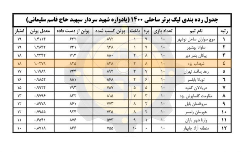 تیم والیبال ساحلی مقاومت شهداب یزد با کسب ۸ پیروزی و ۲ شکست در رتبه چهارم جدول این رقابتها قرار دارد.