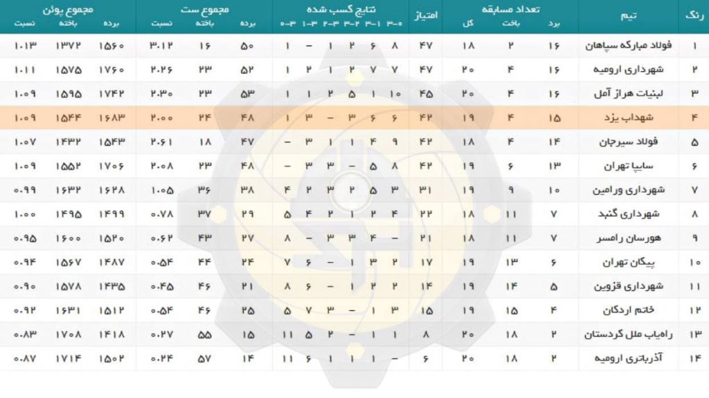 تثبیت جایگاه چهارمی شهدابی ها با پیروزی سه امتیازی مقابل پیکان جدول رده بندی رقابت های لیگ برتر والیبال تا پایان هفته بیست و دوم ۲ بهمن ۱۳۹۹ shahdab