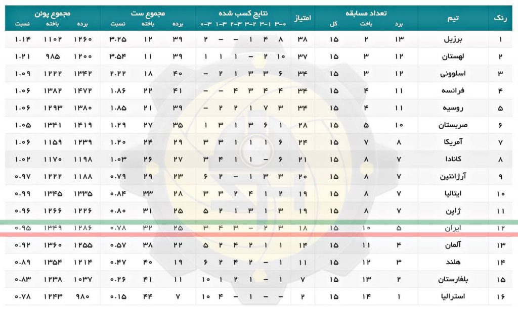 تیم ملی والیبال ایران با عملکرد غیر قابل قبول در این دوره از رقابتها به عقیده بسیاری از کارشناسان؛ در جایگاه دور از انتظار دوازدهم قرارگرفت و به کار خود در این دوره از رقابتها پایان داد.