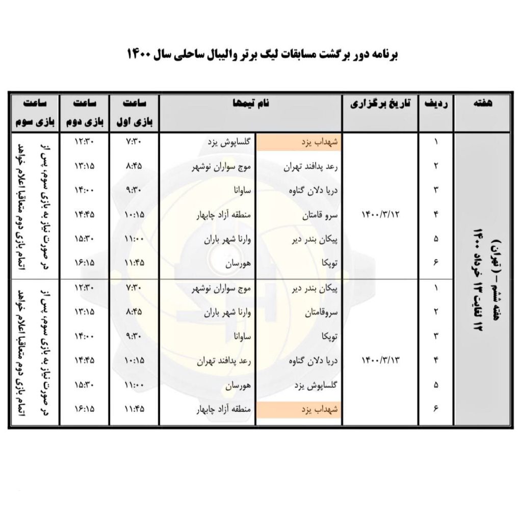 📋برنامه کامل دور پنجم و ششم (دور برگشت) لیگ برتر والیبال ساحلی باشگاه های کشور سال ۱۴۰۰ (هفته های ۱۲، ۱۳، ۱۴، ۱۵ و ۱۶ ام) به میزبانی شهر تهران، باشگاه پیکان