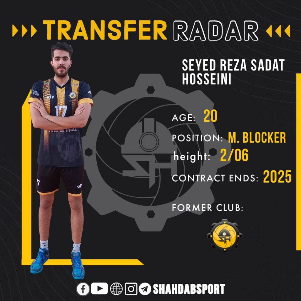 با نظر کادر فنی تیم والیبال مقاومت شهداب یزد و در راستای اهداف اصلی باشگاه فرهنگی ورزشی مقاومت شهداب که گسترش فرهنگ ورزش در جامعه و اهمیت به بومی گرایی و همچنین اهمیت به والیبال پایه میباشد، سیدرضاسادات‌الحسینی مدافع وسط(سرعتی زن) ۲۰ساله و ۲متر و ۶ سانتی‌متر یزدی با عقد قراردادی سه ساله به تیم والیبال مقاومت شهداب یزد پیوست.