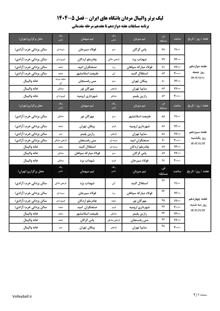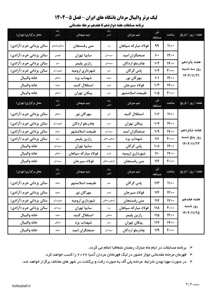 به گزارش روابط عمومی باشگاه فرهنگی ورزشی شهداب یزد، برنامه ادامه نیمفصل نخست و نیمفصل دوم رقابتهای لیگ برتر والیبال مردان کشور تا پایان دور گروهی از سوی سازمان لیگ فدراسیون والیبال اعلام شد.