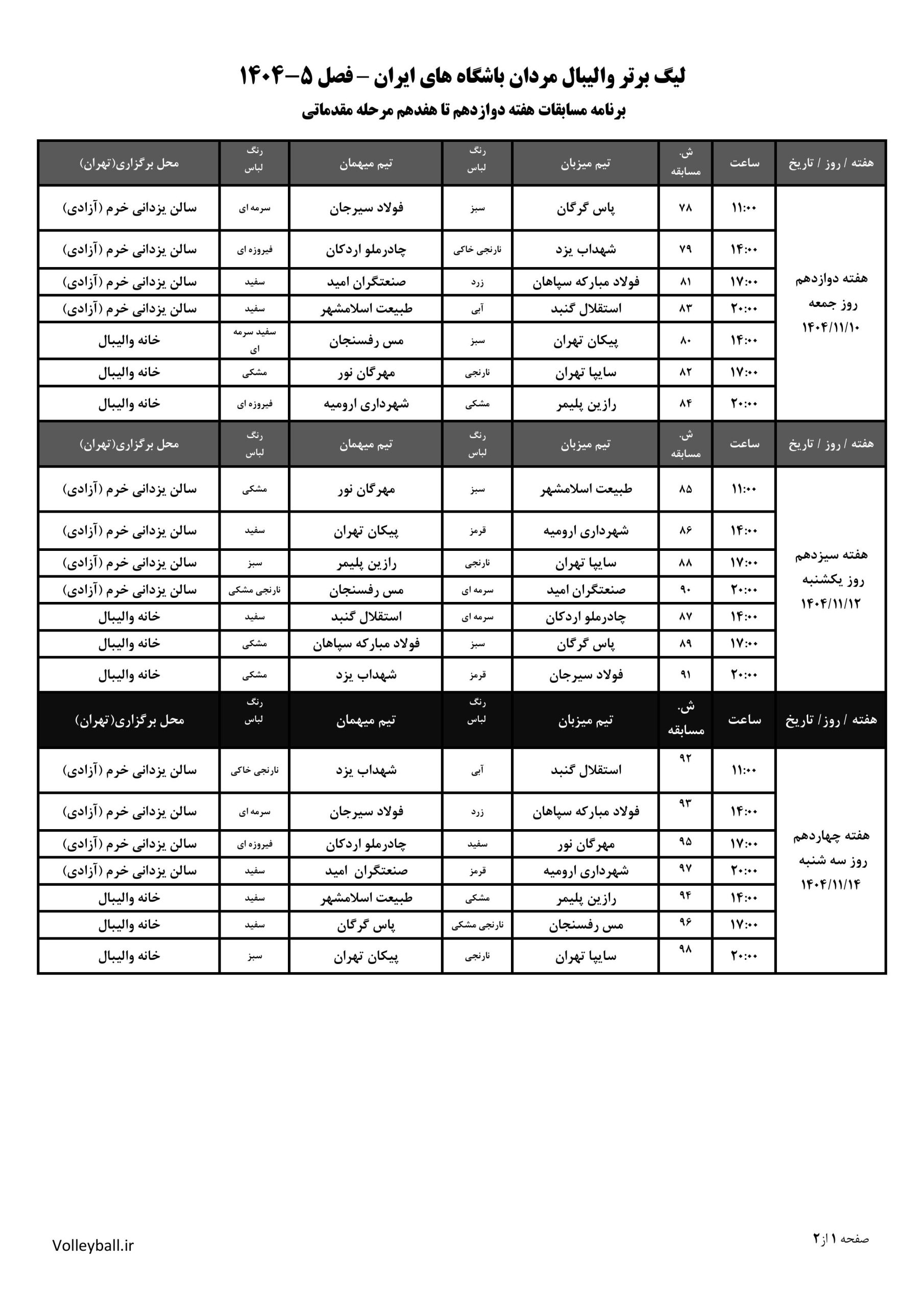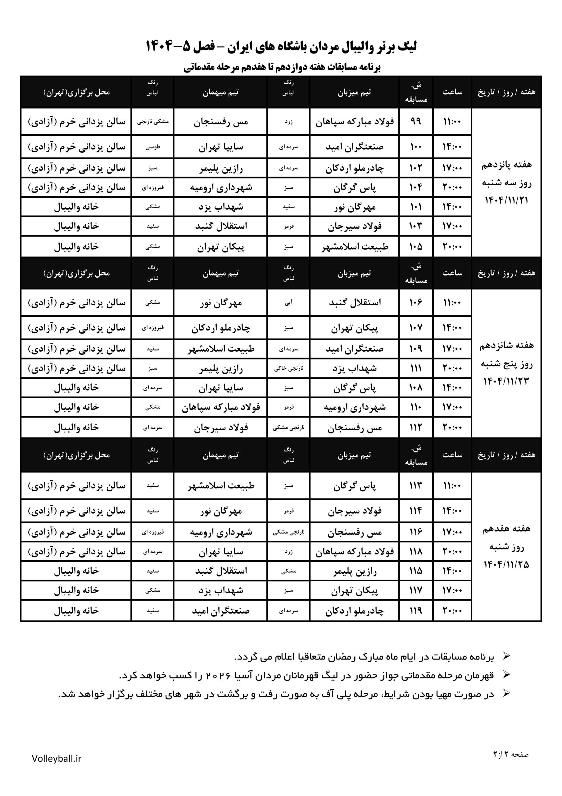 به گزارش روابط عمومی باشگاه فرهنگی ورزشی شهداب یزد، برنامه ادامه نیمفصل نخست و نیمفصل دوم رقابتهای لیگ برتر والیبال مردان کشور تا پایان دور گروهی از سوی سازمان لیگ فدراسیون والیبال اعلام شد.
