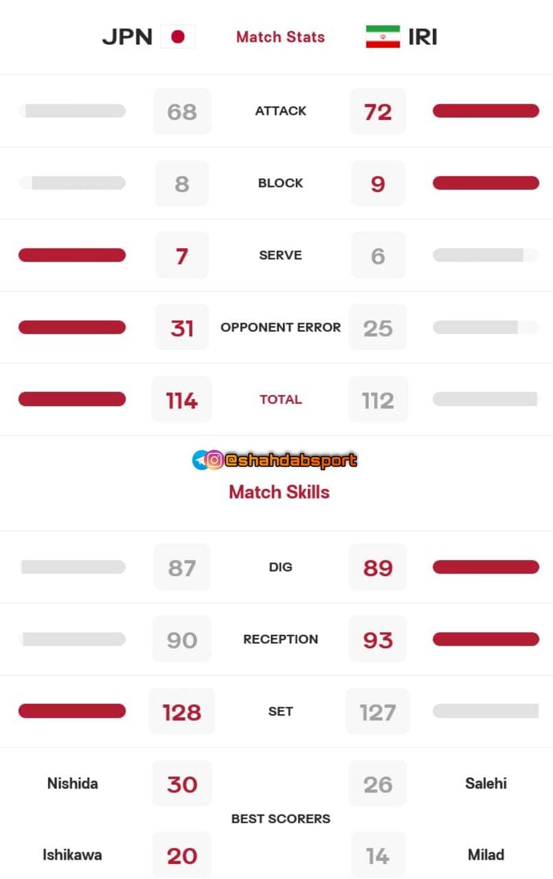 ساعت ۱۵:۱۰ | ۱۰ مرداد ماه ایران ۲➖۳ژاپن 🇮🇷 ۲۱ | ۲۵ | ۳۱ | ۲۲ | ۱۳🇯🇵 ۲۵ | ۲۰ | ۲۹ | ۲۵ | ۱۵ امتیازآورترین هامیثم صالحی: ۲۶ امتیازنیشیدا: ۳۰ امتیاز شهداب، گوهر جهان شهر یزد