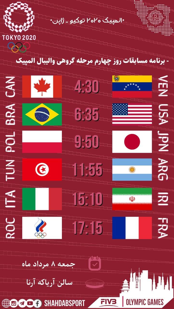 جمعه ۸ مرداد ساعت ۴:۳۰ ونزوئلا 🆚 کانادا ساعت ۶:۳۵برزیل 🆚 آمریکا ساعت ۹:۵۰ژاپن 🆚 لهستان ساعت ۱۱:۵۵آرژانتین 🆚 تونس ساعت ۱۵:۱۰ایران 🆚 ایتالیا ساعت ۱۷:۱۵روسیه 🆚 فرانسه شهداب، گوهر جهان شهر یزد