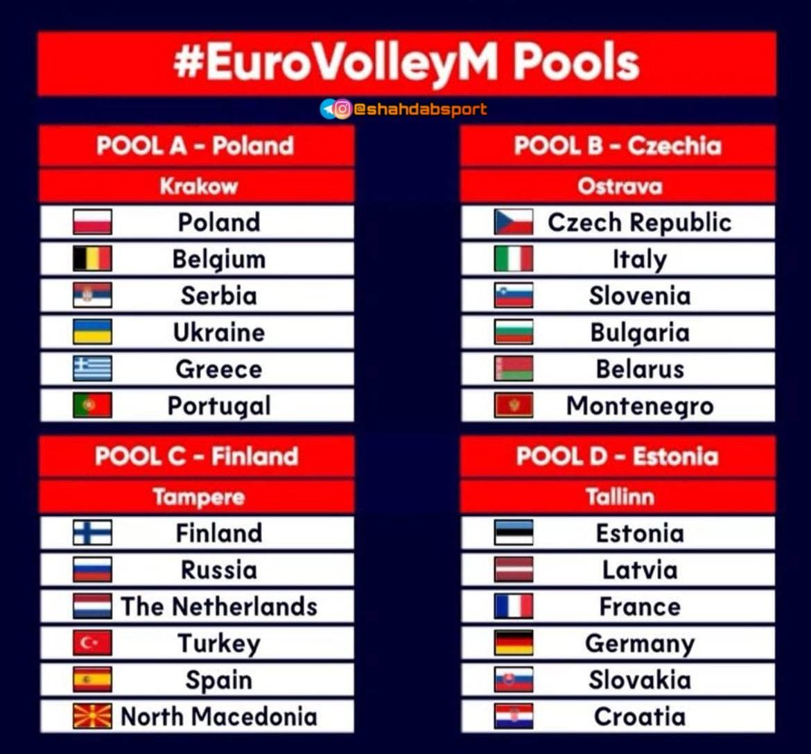 🔸گروه A: لهستان🇵🇱 بلژیک🇧🇪 صربستان🇷🇸 اوکراین🇺🇦 یونان🇬🇷 پرتغال🇵🇹 🔸گروه B: جمهوری چک🇨🇿 ایتالیا🇮🇹 اسلوونی🇸🇮 بلغارستان🇧🇬 بلاروس🇧🇾 مونتهنگرو🇲🇪 🔸گروه C: فنلاند🇫🇮 روسیه🇷🇺 هلند🇳🇱 ترکیه🇹🇷 اسپانیا🇪🇸 مقدونیه شمالی🇲🇰 🔸گروه D: استونی🇪🇪 لتونی🇱🇻 فرانسه🇫🇷 آلمان🇩🇪 اسلواکی🇸🇰 کرواسی🇭🇷 🗓 تاریخ برگزاری: ۱۰ تا ۲۸ شهریور ماه